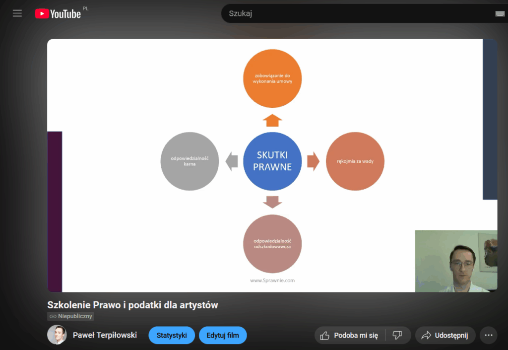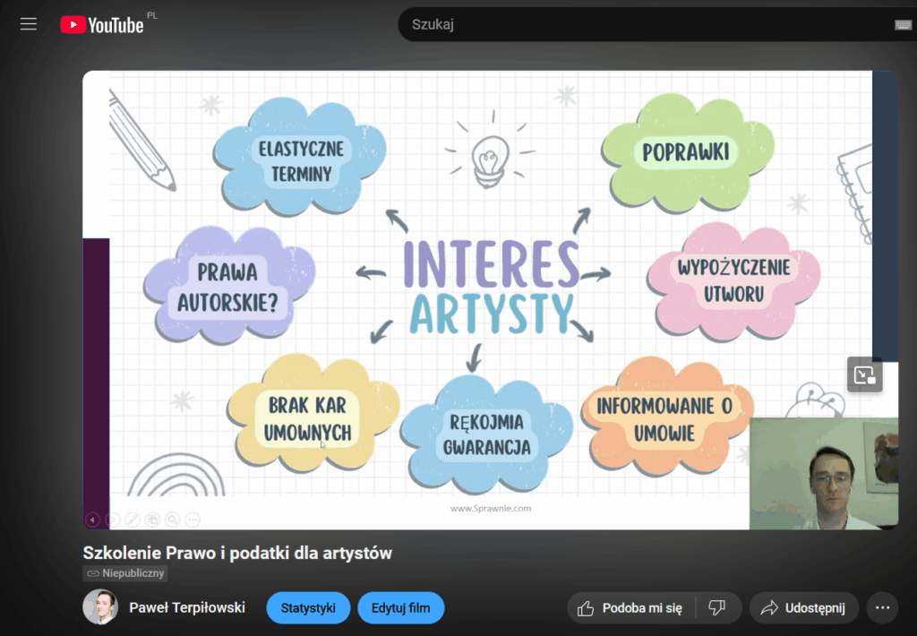Niestety szkoły artystyczne nie przekazują praktycznej wiedzy prawnej, a informacje dostępne w Internecie są wybiórcze i nierzadko sprzeczne. Dlatego przygotowałem szkolenie, które w sposób kompleksowy wyjaśni najważniejsze aspekty prawne i podatkowe prowadzenia działalności artystycznej w relacjach:
